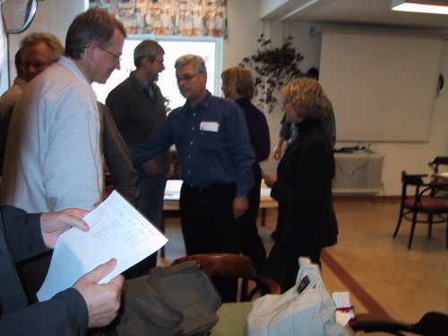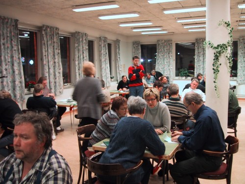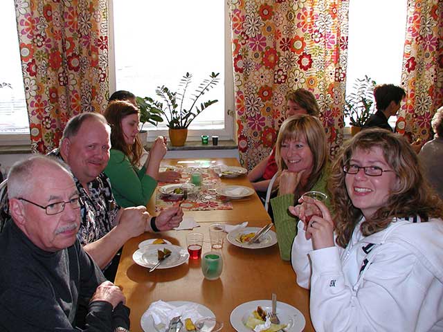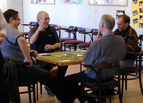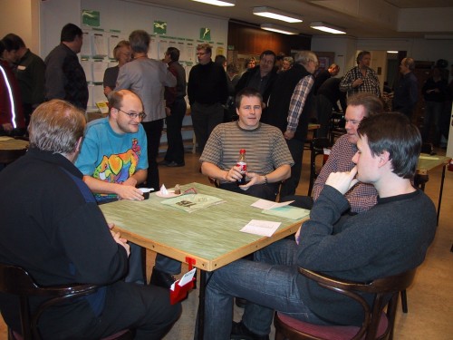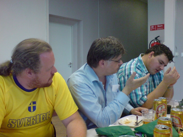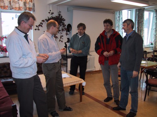 | Christoffer Brännström (bortvänd), Tom Gärds, Morgan Westerlund, Jonas Gustafsson och Fredrik Wikström tar en behövlig fika i pausen. |